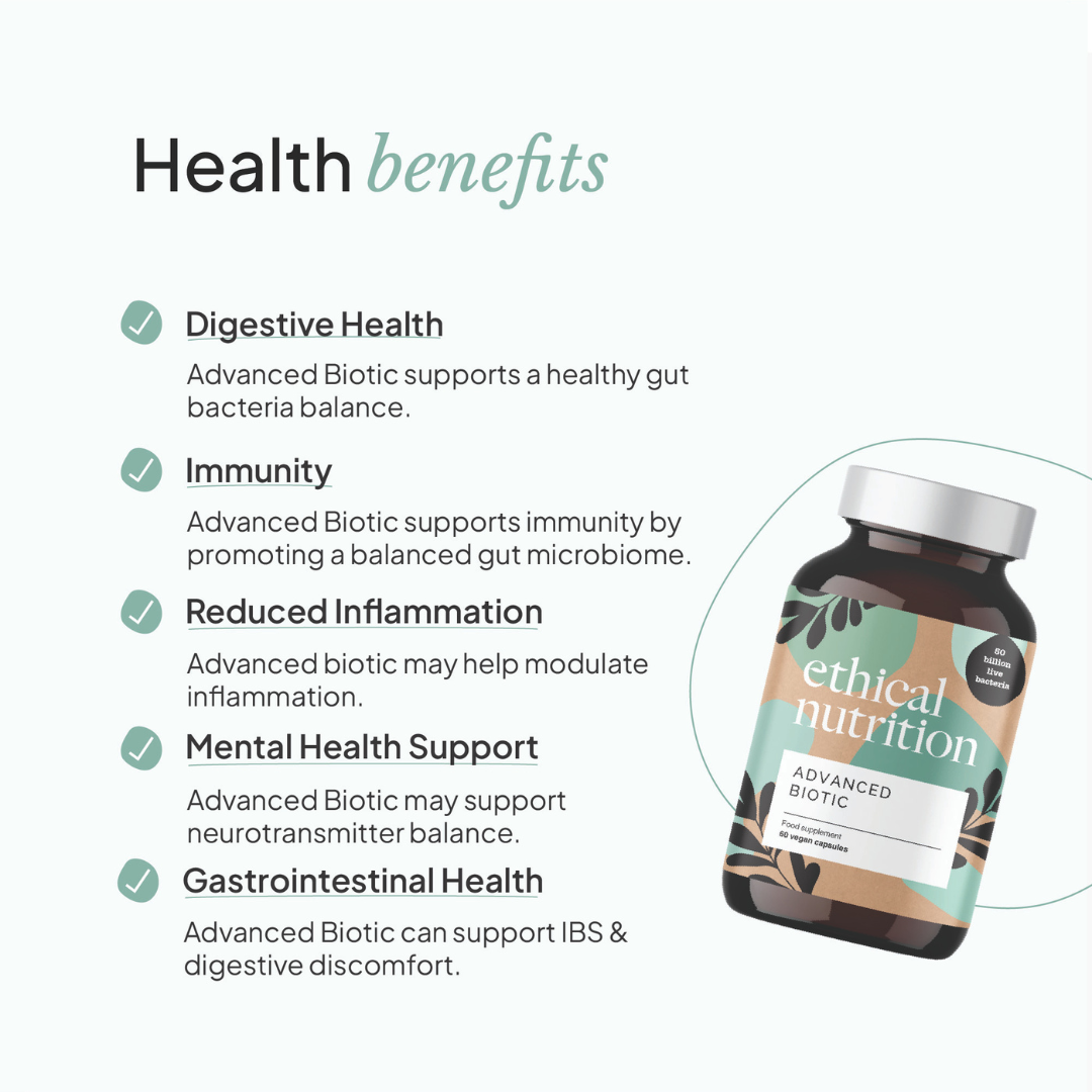 Ethically sourced, dairy free, and Vegan Society approved, Advanced Biotic is the probiotic of choice for gut health, strong immunity, and mental wellbeing. Take it on its own or for total gut support combine with Prebiotic Restore and Digestive Enzymes in our Gut Health Bundle.