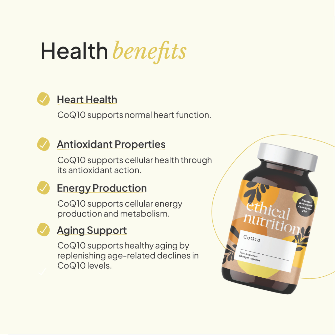 Our CoQ10 (Coenzyme Q10) supplement is uniquely produced through a natural fermentation process, ensuring superior purity and quality. With a high-strength dose of 150mg, it helps maintain optimal CoQ10 levels. Dietary sources like meat and fish contain only small amounts of CoQ10, which is insufficient for many, especially vegans and vegetarians. Boost your CoQ10 levels with our premium, naturally fermented supplement.
