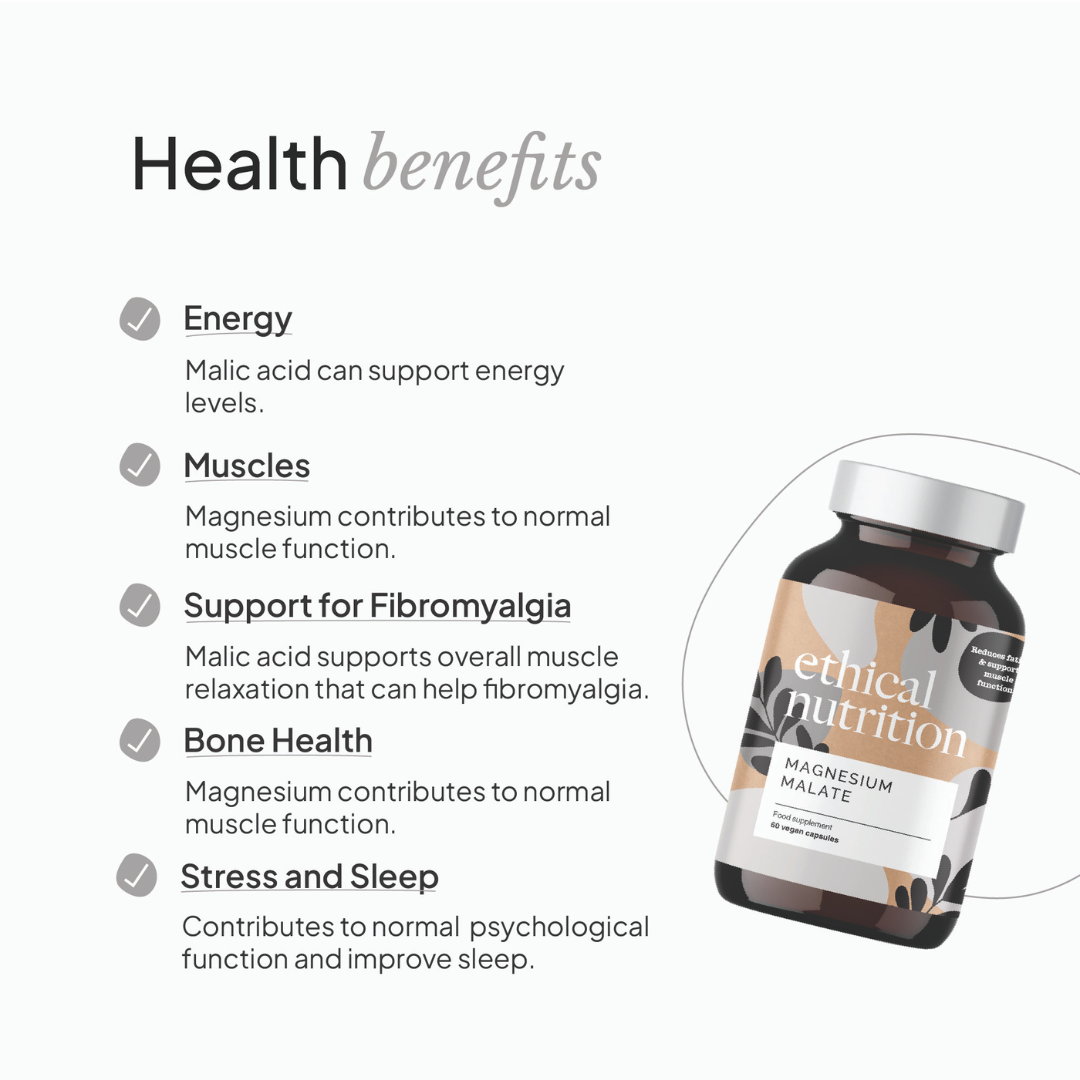 Say goodbye to tiredness, fatigue, and muscle cramps with Magnesium Malate. Combining pure magnesium with malic acid, a key co-factor in energy production, this powerful duo is designed to reignite your energy levels and support healthy muscle function.