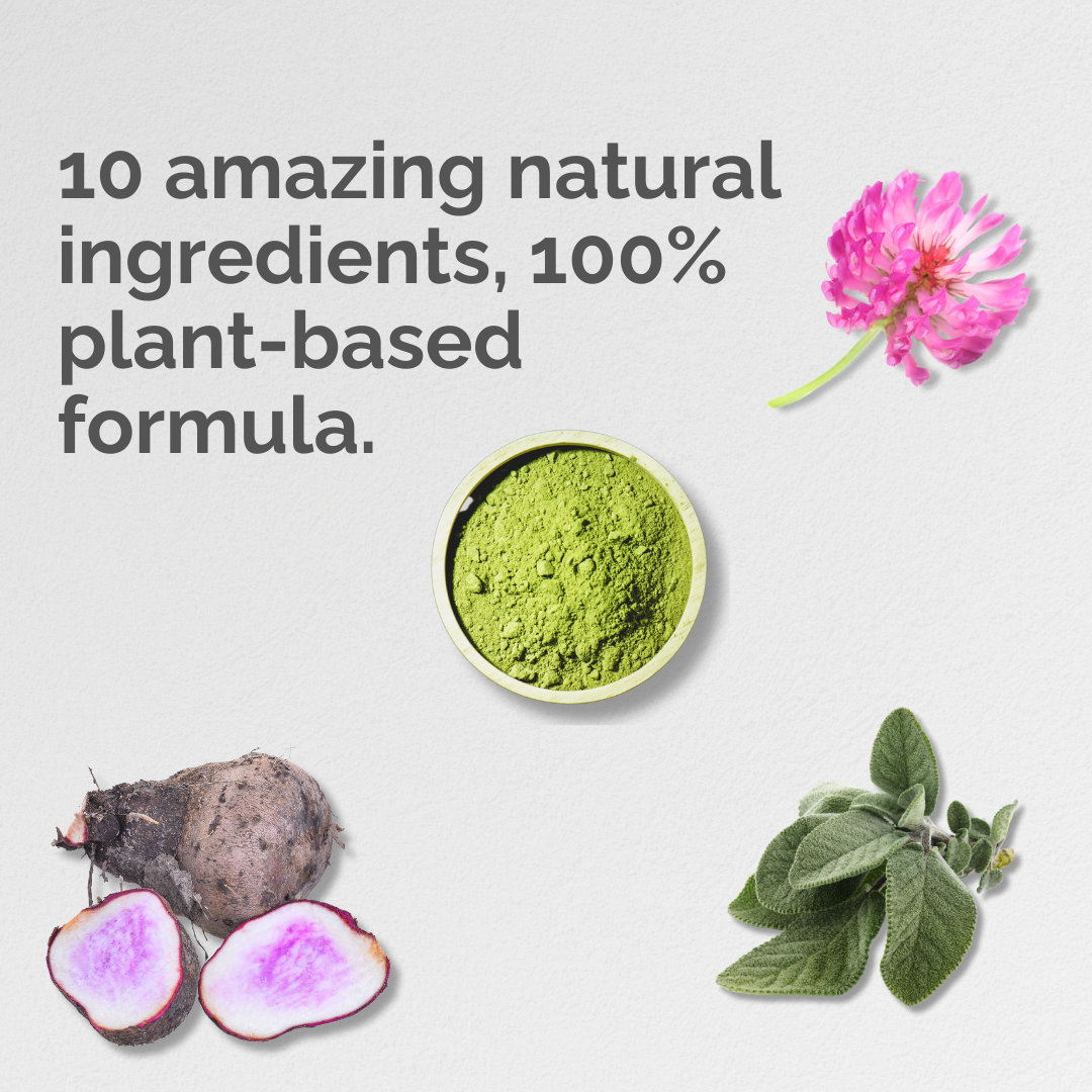 Ingredients: Stoneground Brown Rice Flour (Gluten Free), Mung Bean Powder, Red Clover Extract, Capsule Shell (Vegetable Cellulose), Dandelion Root Extract 4:1 (Taraxacum Officinale), Sage Leaf 4:1 Extract, Hops Extract (Humulus lupulus), Dong Quai Root Extract, Wild Yam Extract, Milk Thistle Seed Extract (Silybum Marianum), Peruvian Maca Root Extract (Lepidium Meyenii), Green Tea Extract (Camellia Sinensis).