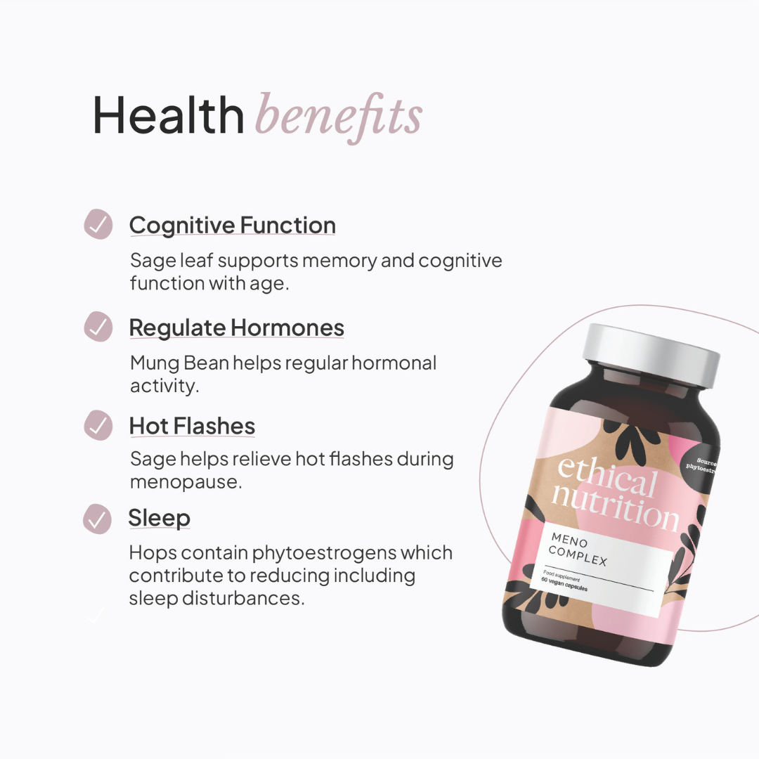 Harness the age-old benefits of botanical extracts including sage, hops, red clover, wild yam, dandelion root, and milk thistle to ease uncomfortable symptoms and provide natural detoxification support. Rich in phytoestrogens and antioxidants, Meno Complex is your complete herbal companion for perimenopause and beyond.