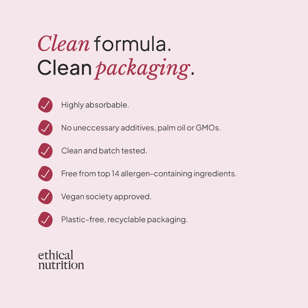 You won’t find any unnecessary fillers, binders or additives in our supplements. They’re free from GMOs, palm oil, flavourings and the top 14 allergen-containing ingredients (including gluten, dairy, soy, and nuts). All of our products are registered with the Vegan Society.
